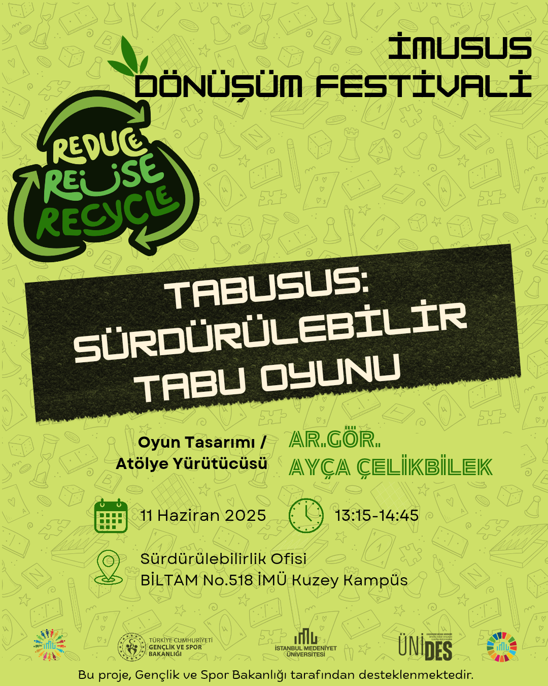 “Dünya Oyun Günü”, bu yıl IMUSUS Dönüşüm Festivali kapsamında, sürdürülebilirlik temasıyla kutlanıyor! 11 Haziran 2025 Çarşamba günü, İstanbul Medeniyet Üniversitesi Sürdürülebilirlik Ofisi ev sahipliğinde gerçekleşecek etkinlikte, gün boyu sürecek üç özel atölye ile Sürdürülebilir İMÜ ekipleri tarafından tasarlanmış oyunlar katılımcılarla buluşacak.