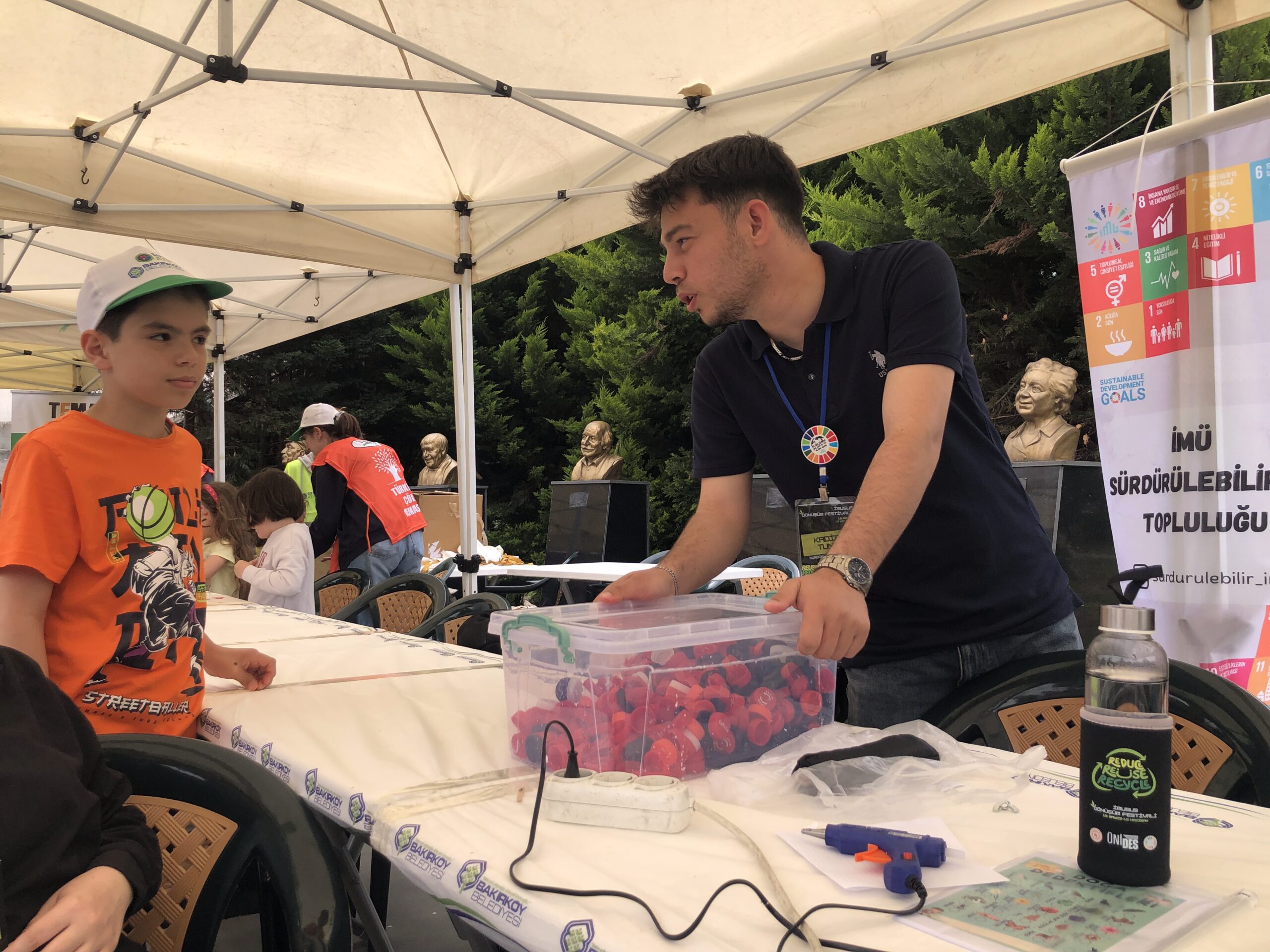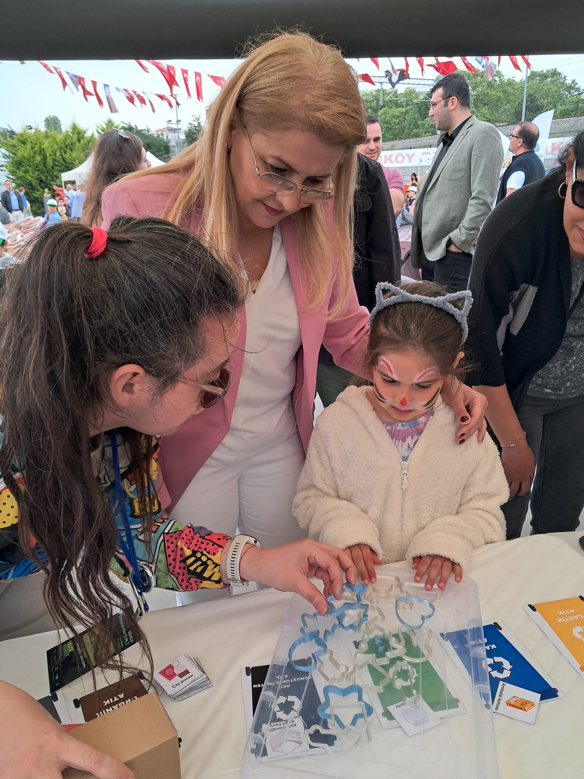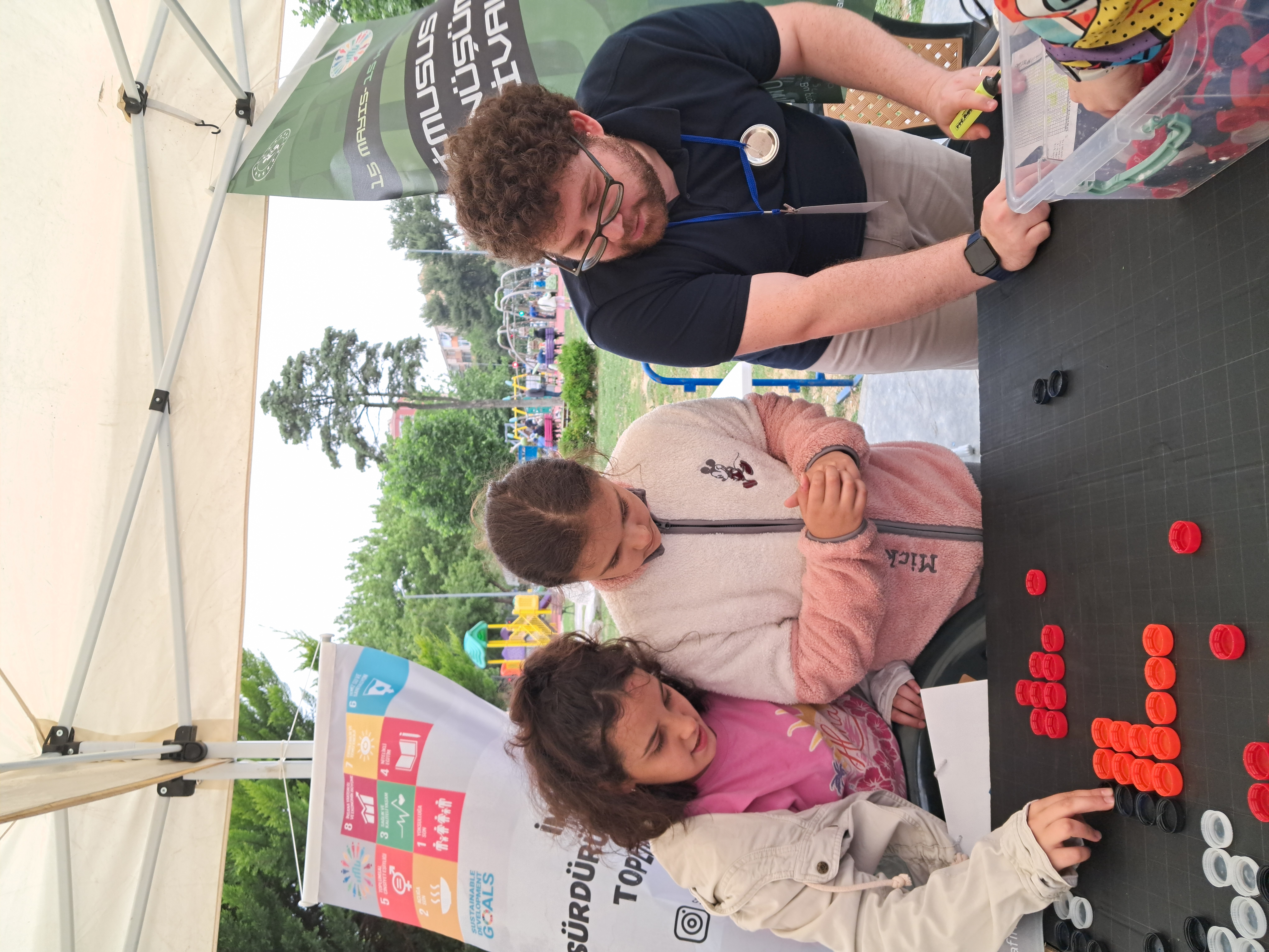 The second workshop organized by IMUSUS within the scope of the festival was the “Waste Sorting Game” with environmental education for children. Designed by Istanbul Medeniyet University Sustainability Office, this educational game aimed to convey basic information about the zero waste system in force in Turkey to children in a fun way. In the game, children were given cards representing plastic, glass, metal, paper, medical waste, electronic waste, organic waste and non-recyclable waste types, and were asked to correctly dispose of these wastes in color-coded boxes. Children were informed about the types of recyclable and non-recyclable materials and their awareness of source separation was improved. At the end of the event, children were presented with play dough molds produced by recycling plastic bottles in the plastic bottle recycling workshops organized by the IMU Sustainability Student Club within the scope of the “Transformation Festival”, giving children a permanent environmental message and introducing them to recycling products.