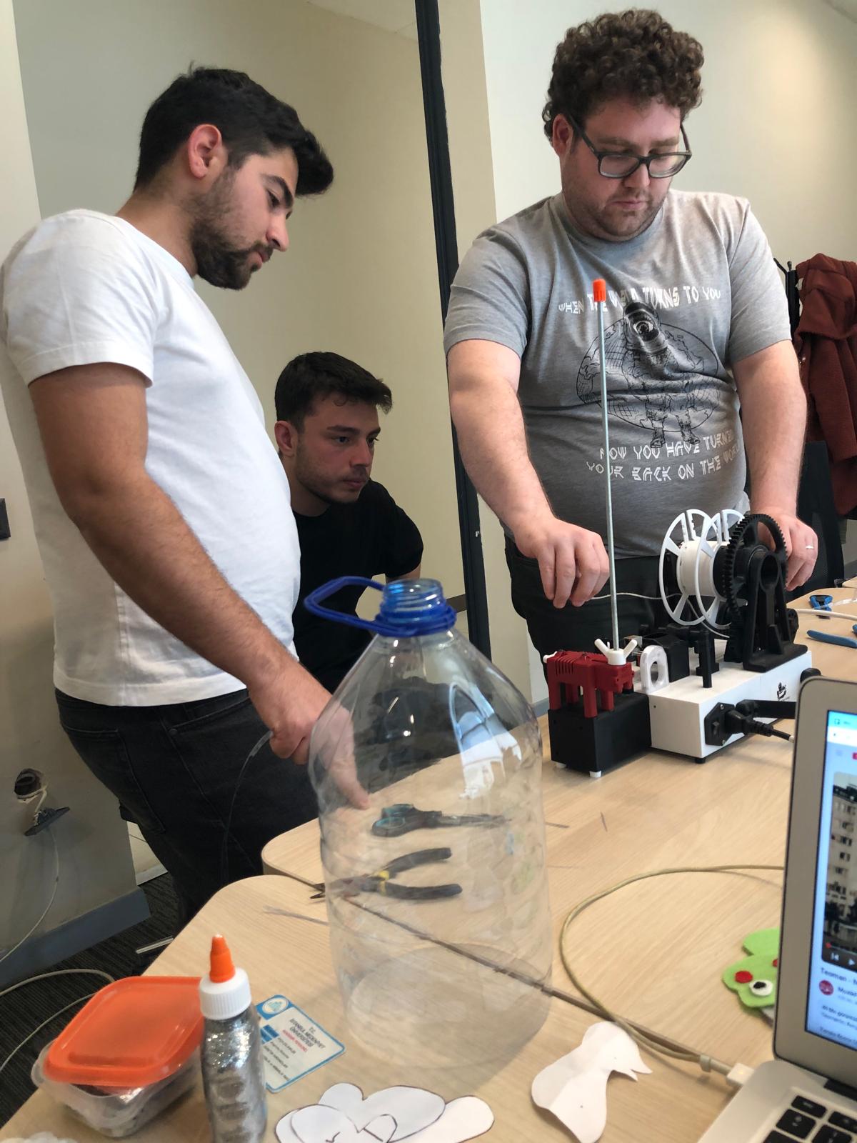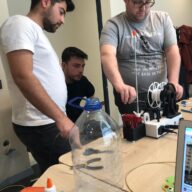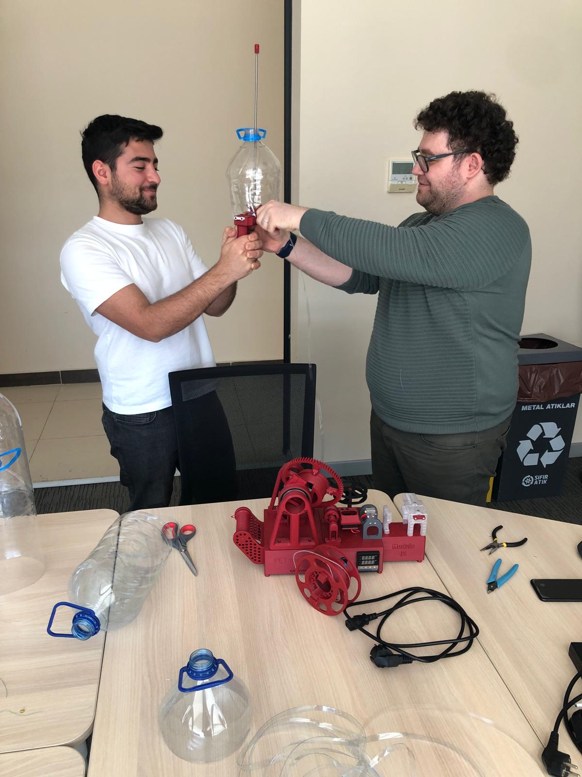 After the general information about the project, the Head of IMUSUS Student Club, Res. Asst. Furkan Eruçar introduced the working principle and usage of PETmachine designed by Tylman Design. After the participants acquired basic machine knowledge, the workshop applications started. At this stage, PET bottles were turned into filaments and transformed into various products through 3D printers.