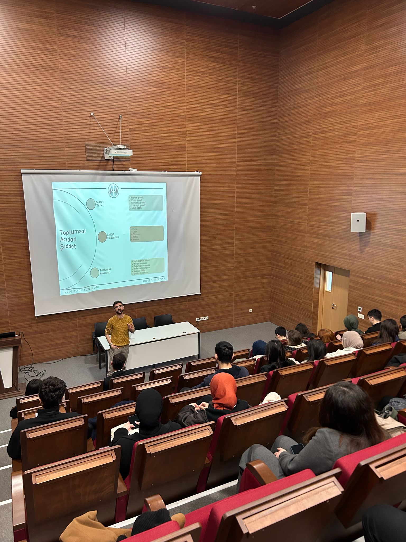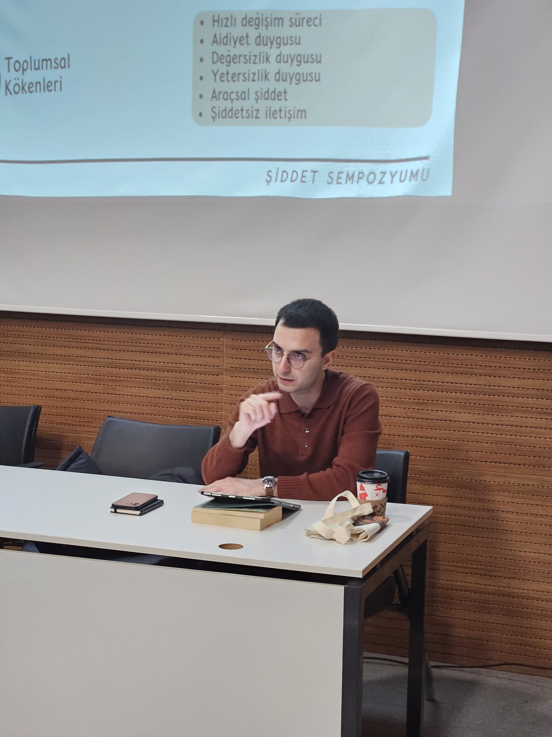 Addressing the concept of violence from a psychological perspective, Res. Asst. İbrahim Şahin ATEŞ explained the nature and formation process of violence from a psychoanalytic perspective. Explaining the classical psychoanalytic theory’s view of violence, ATEŞ discussed the violent tendencies of human beings and criticisms against this theory.