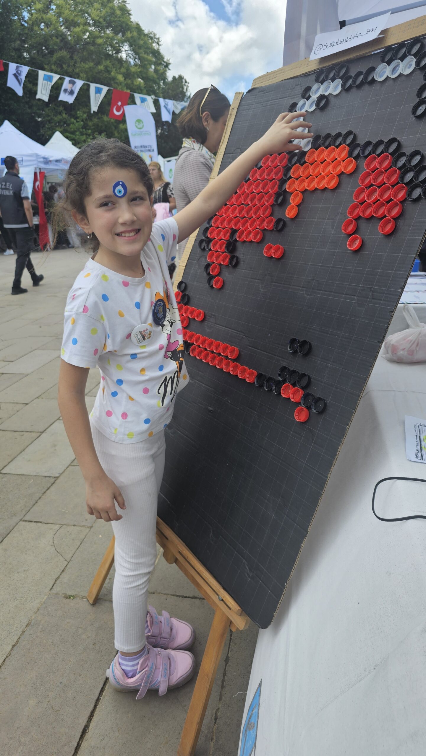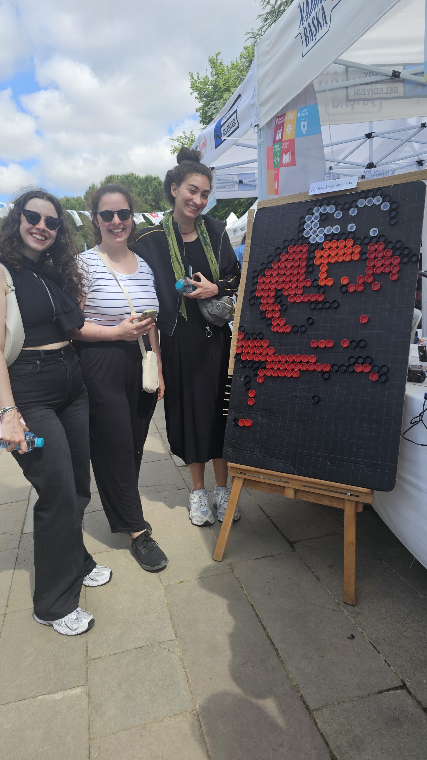 Atıkların geri dönüştürülmesinin önemine dikkat çeken sürdürülebilirlik ekibi aynı zamanda kaynakların verimliliğinin sağlanabilmesi için atık piramiti ilkelerine uyulmasının önemine dikkat çekmek üzere, festival süresince stant katılımcılarının da dahil olduğu bir ileri dönüşüm çalışması gerçekleştirdi. Festival süresince kurumumuzun standında gerçekleştirilen “İleri Dönüşüm Sanat Atölyesi”nde İMÜ Sürdürülebilirlik Topluluğu’nun kampüs alanlarımızdan, cafe ve restaurantlardan topladığı, atık haline gelmiş plastik kapaklardan piksel art metodu ile bir tablo oluşturuldu. Katılımcılar, kendilerine verilen koordinatlarla kapakları doğru alana yerleştirerek hem eserin ortaya çıkmasına aktif katkı sundu hem de “yeniden kullanım”, “atık azaltımı” ve “döngüsel ekonomi” gibi sürdürülebilir kalkınma kavramlarını uygulamalı olarak deneyimledi. Bu yaratıcı geri kazanım projesiyle toplamda 570 adet plastik kapak kullanılırken, yaklaşık 765gr plastik ileri dönüştürülerek atık olmaktan kurtarıldı. Tamamlanan eser, İMÜ Sürdürülebilirlik Topluluğu’nun plastik atıkların yarattığı çevre kirliliğine ve kişilerin plastik kullanımı kaynaklı oluşan çevresel ayak izine dikkat çekmek üzere hazırlayacağı Dönüşüm Festivali sergisinde sergilenecek dördüncü eser oldu.