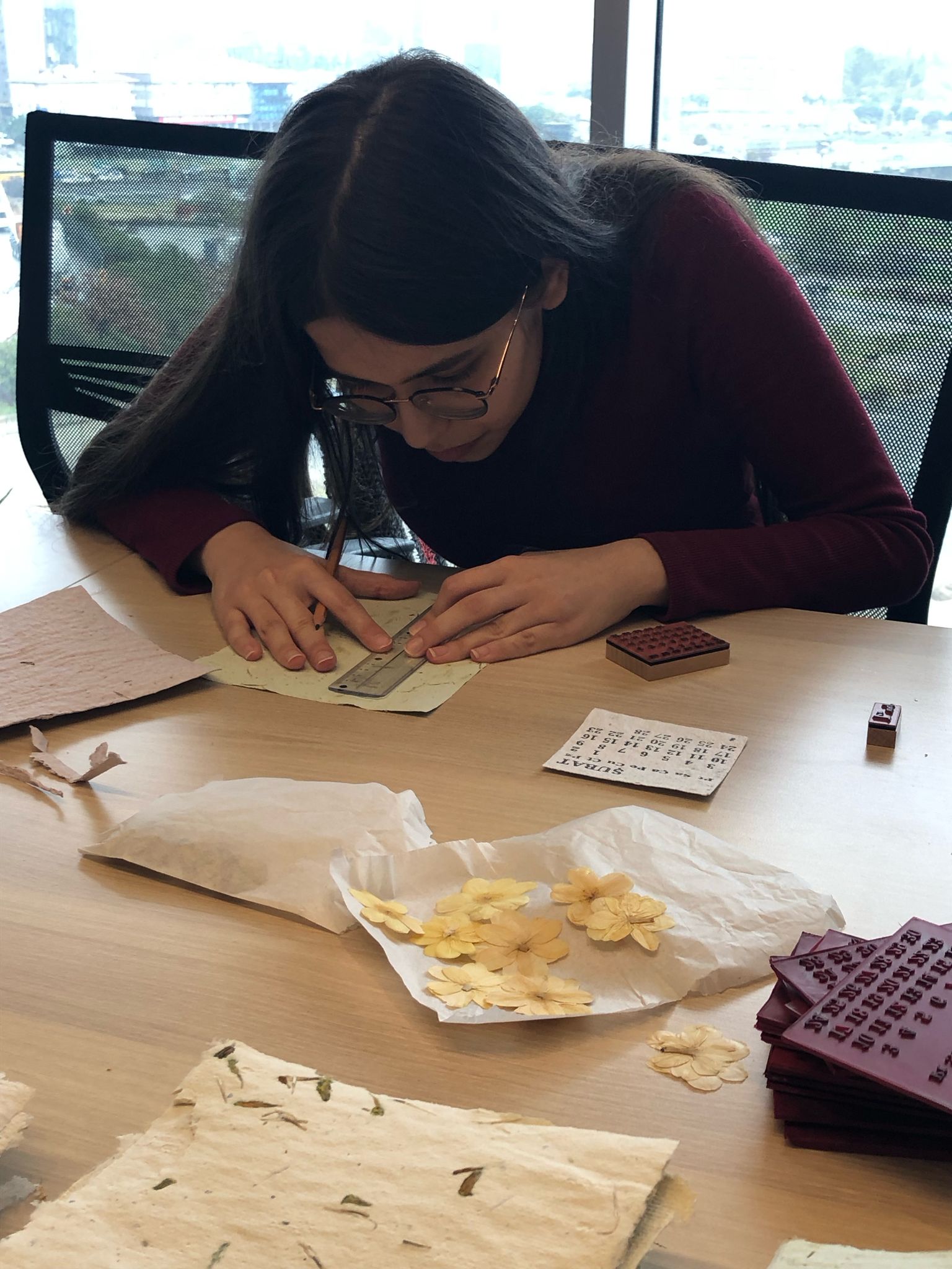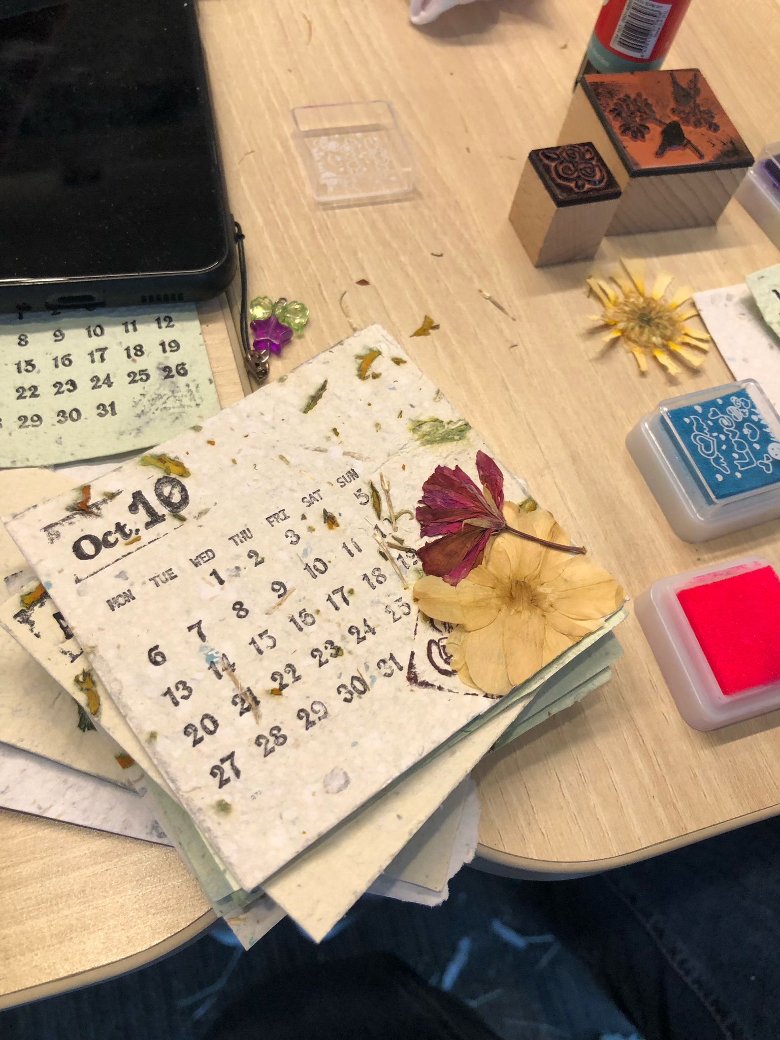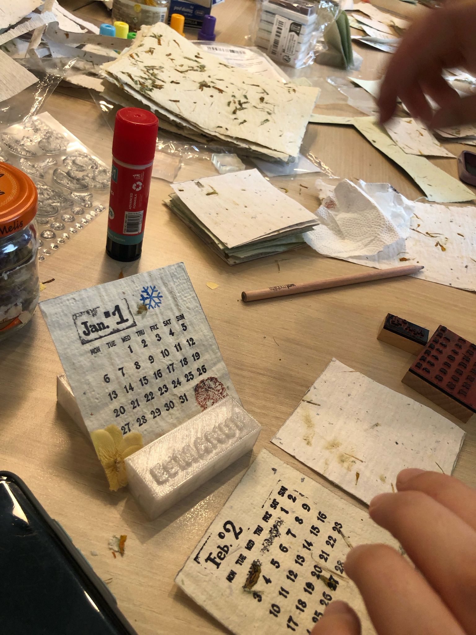 Son olarak, “Kendin Yap- Takvim Atölyesi”nde katılımcılar, geri dönüştürülmüş materyaller ile ürettikleri malzemeleri birleştirerek kendilerine özel, kişiselleştirilmiş takvimlerini tasarladı. Sürdürülebilirlik Ofisi araştırma görevlisi Ayça ÇELİKBİLEK‘in yürütücülüğünü yaptığı atölyede, katılımcılar kendi kişiselleştirilmiş takvimlerini üretti. Öncelikle katılımcılar geri dönüşüm ile üretilen tohumlu kağıtlara aylık takvim baskılarını yaptı. Baskı aşamasında topluluk tarafından PET malzemelerin dönüştürülmesi ile üretilen baskı kalıpları kullanıldı. Sonrasında, katılımcılar takvimlerini BioBlitz atölyelerinde toplanıp kurutulan çiçekler ile süsledi. Bu aşamada ÇELİKBİLEK, katılımcılara hem süslemelerde hem de tohumlu kağıt üretiminde kullanılan her bir çiçek ve tohum alma süreci ile ilgili bilgilendirmelerde bulundu. Sonrasında, katılımcılar yaptıkları takvimleri kendi zevklerine göre kuru çiçekler, çizimler ve baskılar ile süsleyip kişiselleştirdi. Hazırlanan takvim kartlarının önceki atölyede üretilen takvim altlarına yerleştirilmesi ile takvim üretimleri tamamlandı.