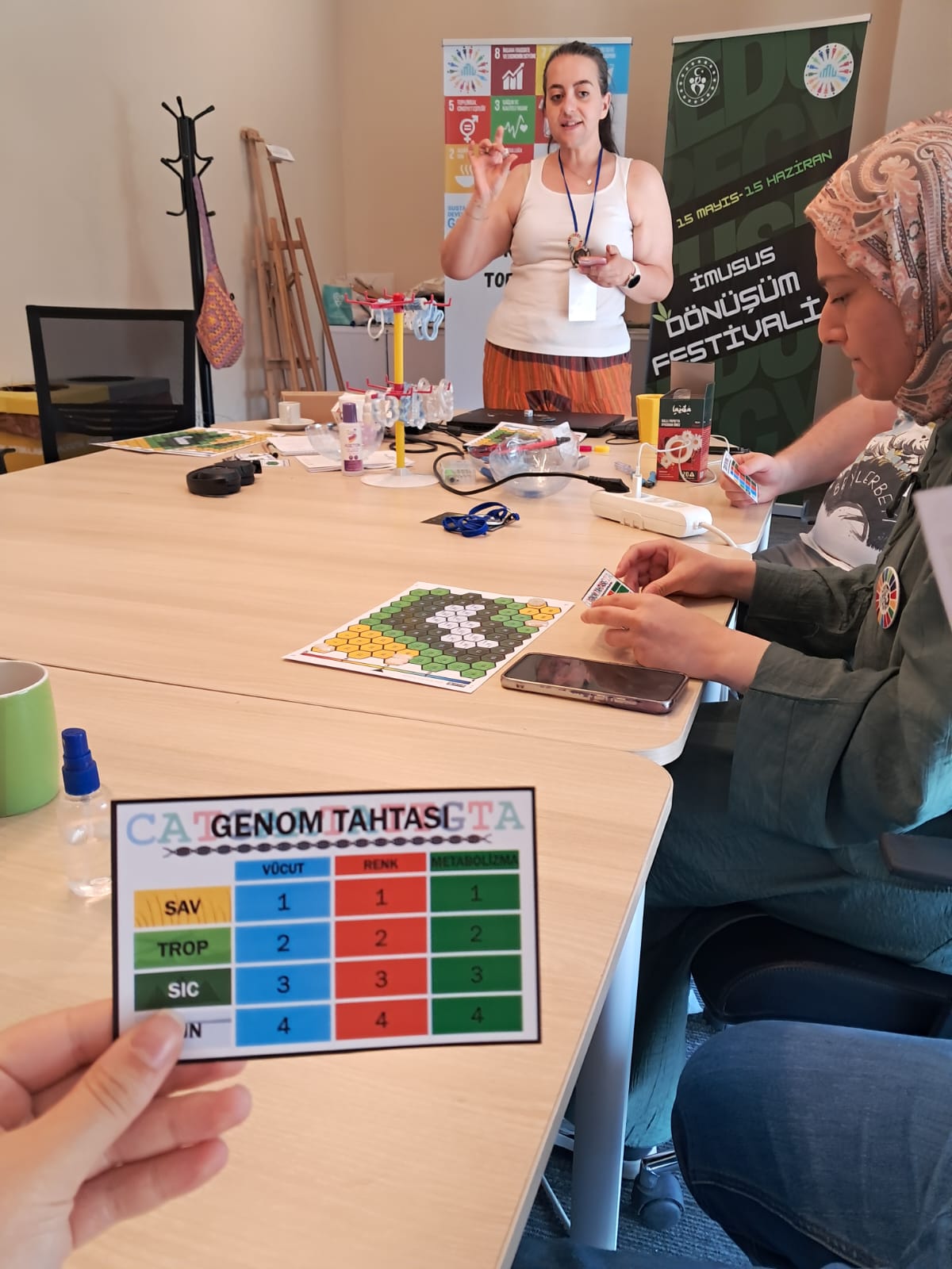 Etkinliğin ilk oyunu olan “İklim ve Sağlık”, İstanbul Medeniyet Üniversitesi Hemşirelik Bölümü 2. sınıf öğrencisi, Dönüşüm Festivali proje koordinatörü ve topluluk yönetim kurulu üyesi Sıla Selin ÖZKAN tarafından tasarlandı. Festival süresince geliştirilen oyun, Dünya Oyun Günü programına dahil edildi. Bir rol yapma oyunu (role-play game) olarak tasarlanan “İklim ve Sağlık” oyununda katılımcılar, farklı sağlık çalışanlarının rollerini üstlenerek iklim değişikliğinin yol açtığı acil durum senaryolarında stratejik kararlar aldı. Oyun süresince her turda koşullar değişti; doğal afetler, salgın hastalıklar veya çevresel krizler senaryonun bir parçası haline geldi. Katılımcılar yalnızca kendi rollerini değil, aynı zamanda farklı ülkeler ve kurumlarla iş birliği yapma sürecini de deneyimlediler. Oyun ile pek çok SDG’ye ilişkin farkındalık yaratılırken, özellikle SDG 3 (Sağlık ve Kaliteli Yaşam) ve SDG 13 (İklim Eylemi) hedeflerine doğrudan katkı sağlayan bir içerik sunuldu. Katılımcılar, iklim değişikliğinin sadece halk sağlığı değil, sağlık sistemleri üzerindeki etkilerini de somut örnekler üzerinden deneyimlerken, aynı zamanda stratejik karar verme ve kriz yönetimi becerilerini geliştirdi. Oyun atölyesine özellikle hemşirelik, sağlık yönetimi gibi bölümlerde eğitim görmekte olan öğrenciler yoğun ilgi gösterdi.
