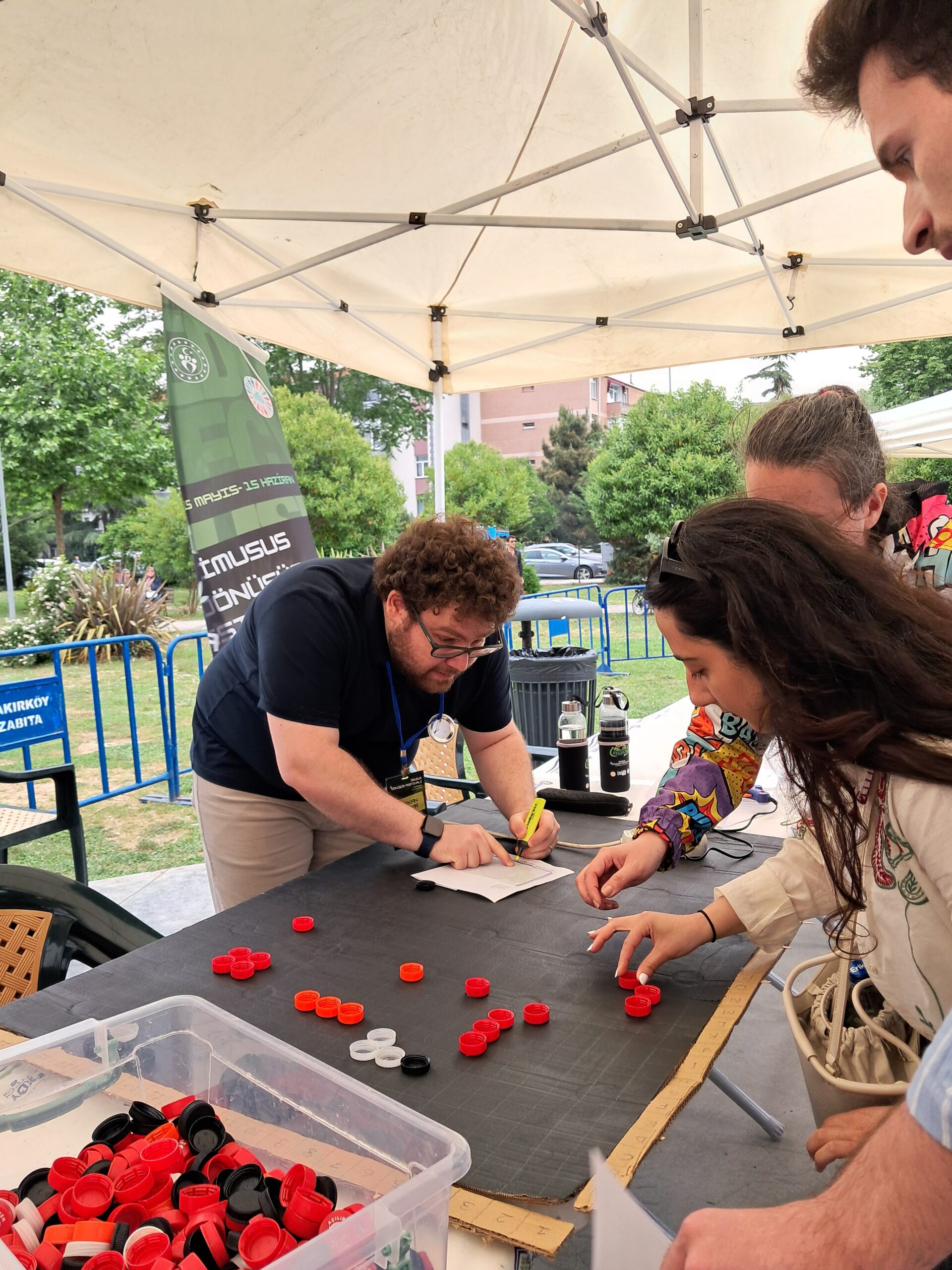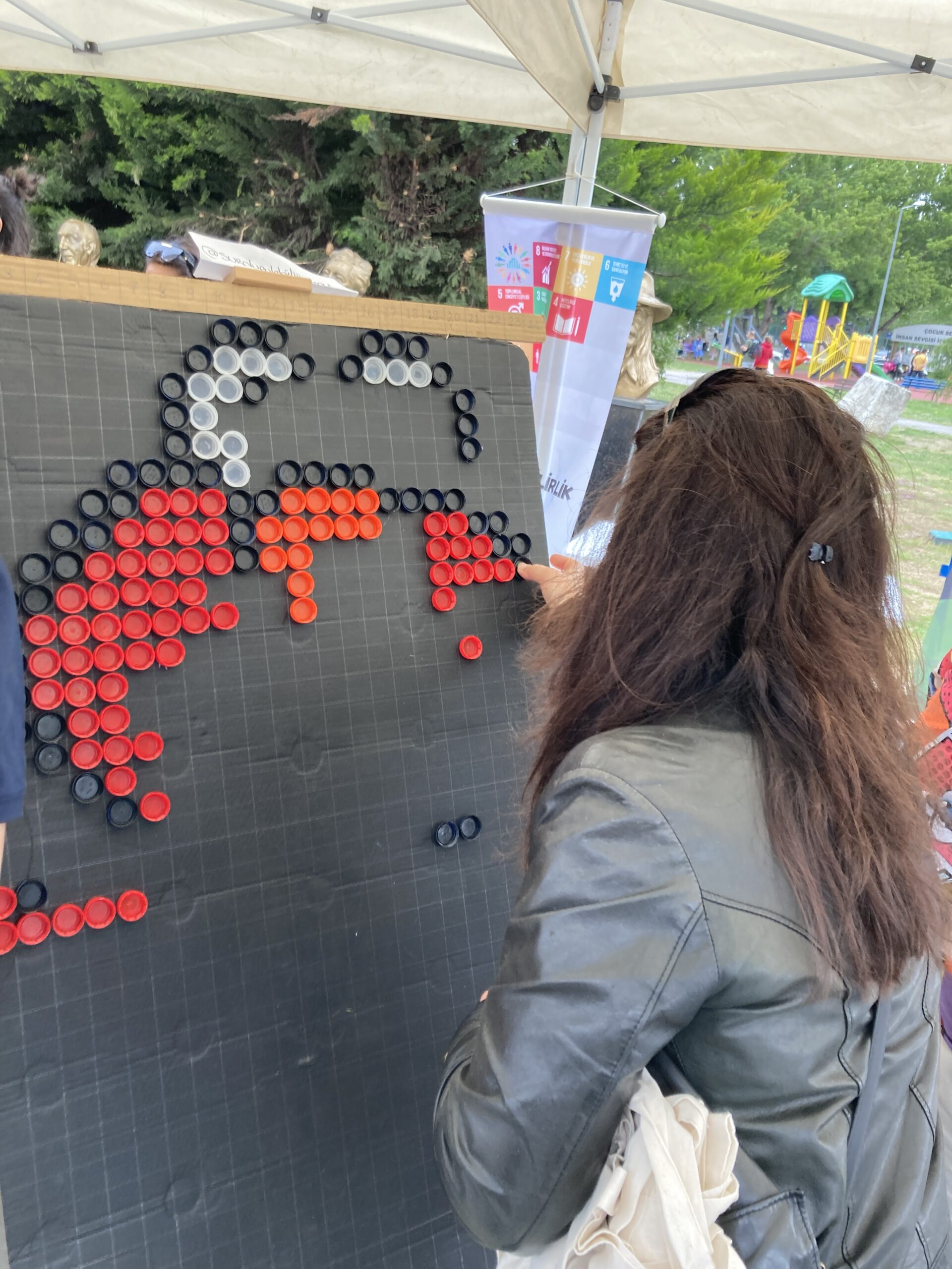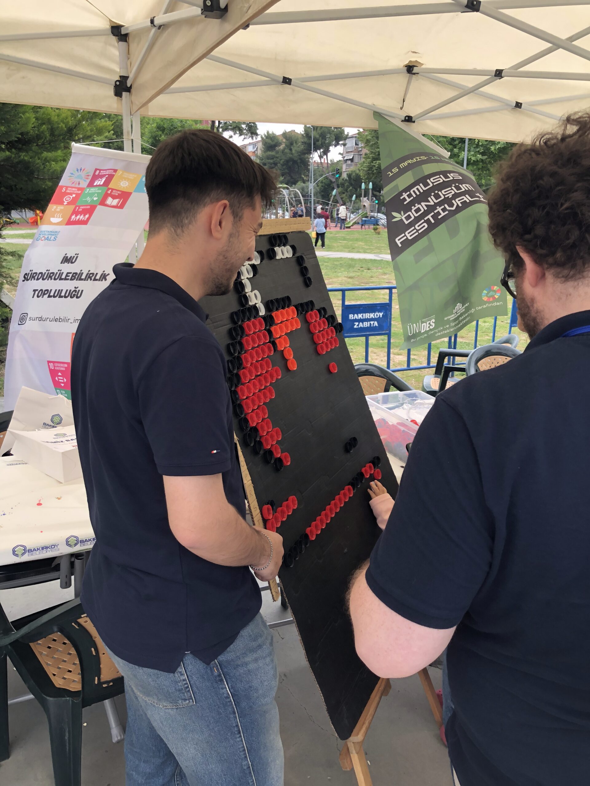 Pazar günü saat 13:00-16:30 saatleri arasında kamuya açık olarak gerçekleştirilen şenlikte, IMUSUS plastik kapakların sanat eserine dönüştürüldüğü bir “Plastik İleri Dönüşüm” atölyesi düzenledi. Şenlik süresince devam eden atölyede, topluluğun kampüs içerisindeki cafe ve kantinlerden topladığı plastik kapaklar ile marketlerden temin edilen atık kartonlar kullanılarak, katılımcıların yardımıyla Susam Sokağı şovunun ünlü karakteri Elmo’nun yer aldığı bir tablo oluşturuldu. Katılımcılar, kendilerine verilen koordinatlarla kapakları doğru alana yerleştirerek hem eserin ortaya çıkmasına aktif katkı sundu hem de “yeniden kullanım”, “atık azaltımı” ve “döngüsel ekonomi” gibi sürdürülebilir kalkınma kavramlarını uygulamalı olarak deneyimledi. Bu yaratıcı geri kazanım projesiyle toplamda 570 adet plastik kapak kullanılırken, yaklaşık 765gr plastik ileri dönüştürülerek atık olmaktan kurtarıldı. Tamamlanan eser, Dönüşüm Festivali sergisinde sergilenecek üçüncü eser oldu.