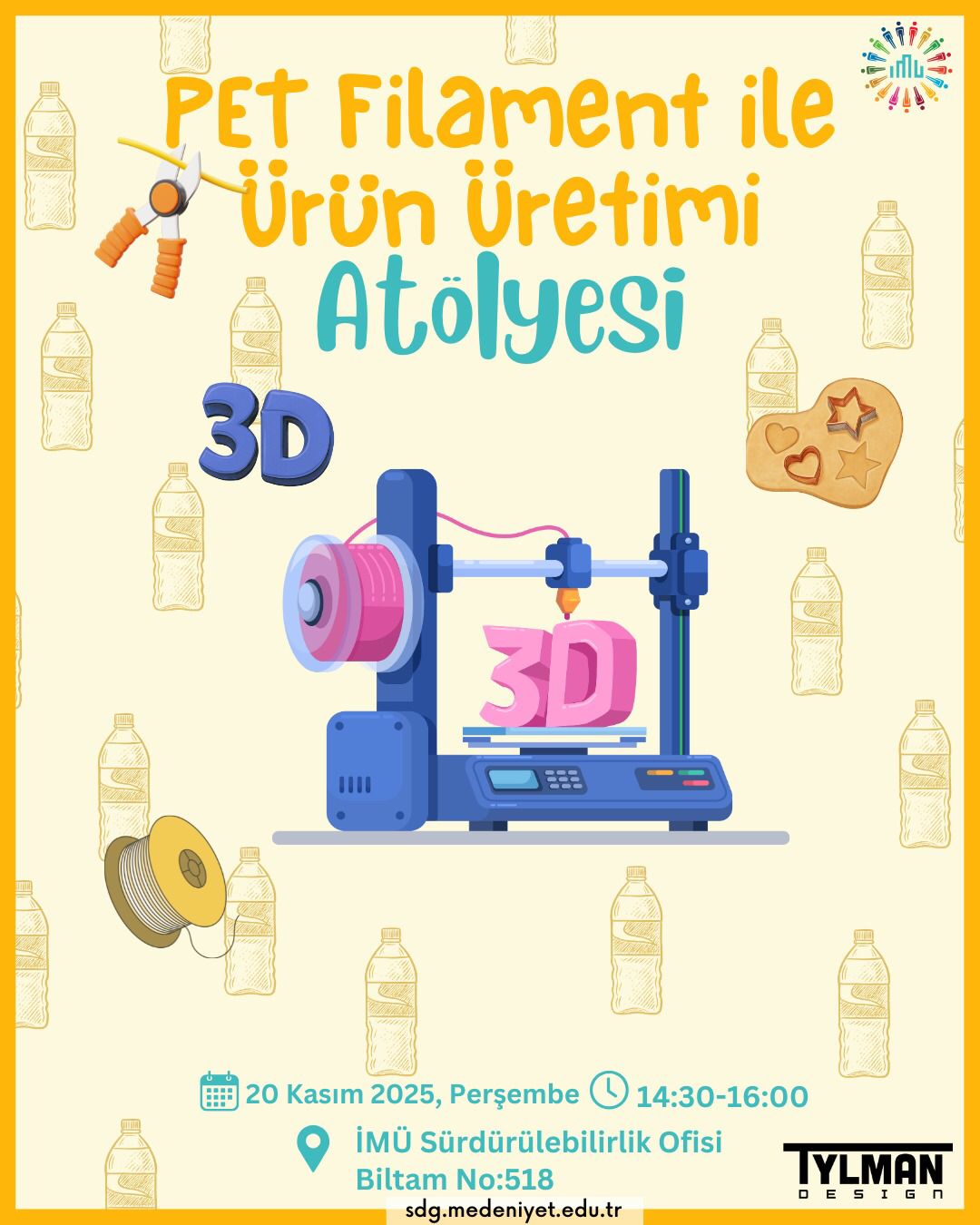 Atölyede, plastik atıkların çevre üzerindeki olumsuz etkileri hakkında bilgi verilecek ve kampüsümüzdeki plastik atıkların ileri dönüştürülmesi ile elde edilen PET filamentlerden 3 boyutlu yazıcılar yardımı ile yeni ürünler elde edilecek.