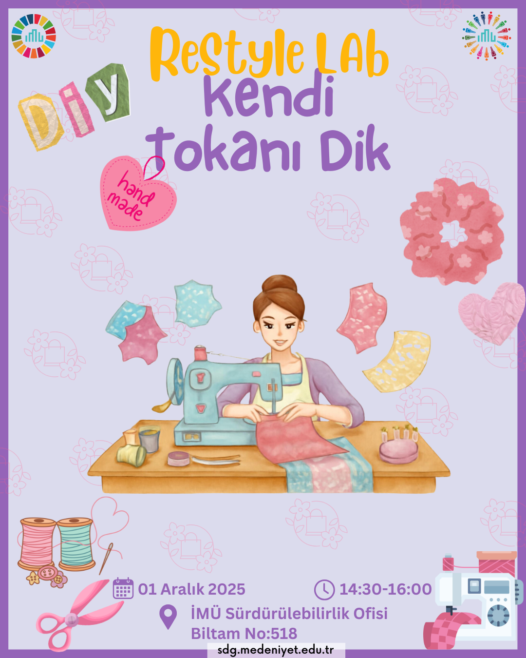 İMÜ Sürdürülebilirlik Topluluğu‘nun düzenlediği Restyle etkinliklerinin ilki olan “ReStyle Lab: Kendi Tokanı Dik” atölyesinde katılımcılar, atık kumaşları ileri dönüştürüp, kendileri için toka hazırlayacak. Moda tasarımcısı Berna ER DOLGUN‘un yürütücülüğünde gerçekleştirilecek olan atölye, Sürdürülebilirlik Ofisi‘nde gerçekleştirilecek ve katılımcı sayısı 10 kişi ile sınırlı olacak.
