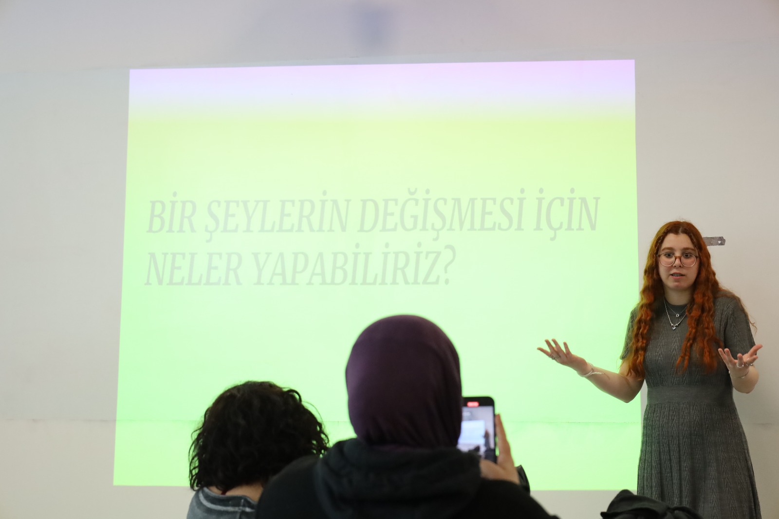 Etkinlikte İMÜ Sosyoloji Bölümü 4. sınıf öğrencisi Zeynep BOZBULUT, kadınların özgürleşmesini ve eşitlik mücadelesini merkezine alan feminizmin tarihte dalgalar halinde gelişimini ve bu süreçte elde edilen temel kazanımları aktardıktan sonra, toplumsal cinsiyet eşitsizliğinin iş gücü, eğitim, sağlık, siyasi katılım gibi yaşamın pek çok alanında kadınların erkeklere göre dezavantajlı konumda olmasına yol açarak kadınları olumsuz etkilediğine dikkat çekti. Toplumsal cinsiyet eşitliği için verilen mücadelede kadınların ve kız çocuklarının güçlendirilerek kadın istihdamının arttırılması, cinsiyetler arası ücret farkının giderilmesi ve özellikle iş hayatında kadınların lider ve yönetici pozisyonlara getirilmesinin önemini vurgulayan BOZBULUT, cinsiyet ayrımcılığı ve kadına yönelik şiddet konularına da değindi.