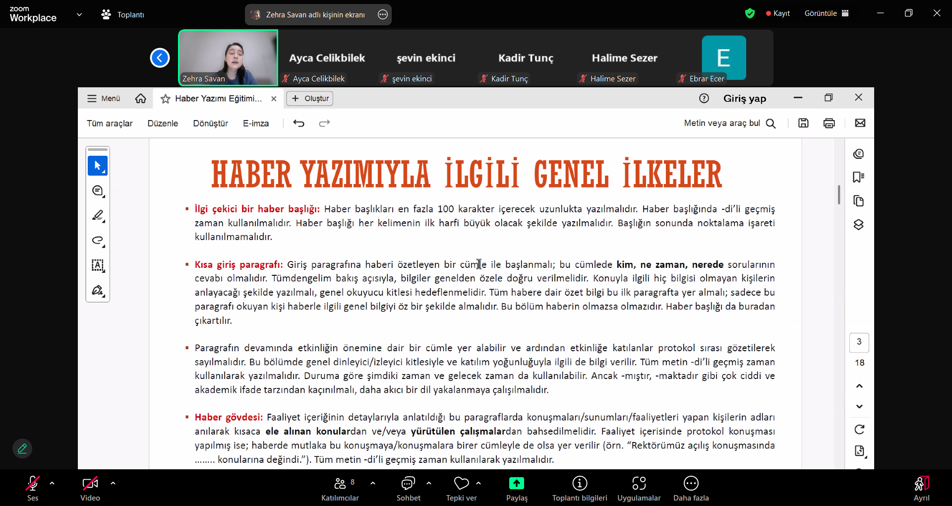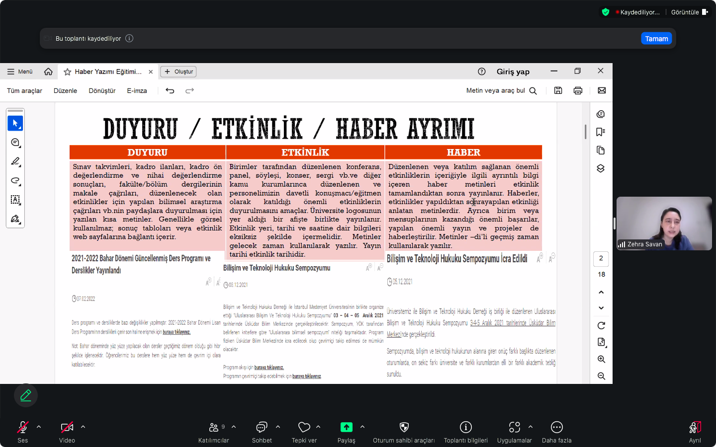 Eğitimin ilk bölümünde, Öğr.Gör. Zehra SAVAN, haber toplama ve haber yazma teknikleri hakkında bir eğitim verdi. SAVAN, doğru ve akıcı bir haberin nasıl yazılması gerektiğine dair bilgiler paylaştıktan sonra, üniversitemizin web sayfalarındaki haberlerin düzeni ve içeriğinin geliştirilmesine yönelik bilgilendirmelerde bulundu. İstanbul Medeniyet Üniversitesi’nin haber paylaştığı mecralardan ve bu mecralardaki haber yazım kurallarından bahseden SAVAN, duyuru, etkinlik ve haber ayrımına değinerek bu kavramları örnekler ile ele aldı. Haber yazımındaki temel unsurlar ve yapılan yaygın hatalar, mevcut haber örnekleri üzerinden incelendi. Katılımcılarla etkileşimli bir şekilde mevcut haberler üzerinden “Nasıl Yazılsa Daha İyi Olur?” başlığı altında haberlerde düzeltilmesi gereken yerler hakkında ve haberlerin nasıl geliştirilebileceği üzerine tartışıldı.
