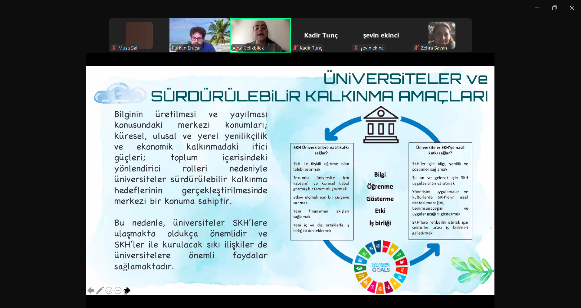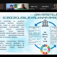 Eğitimin ikinci bölümünde, Ar.Gör. Ayça ÇELİKBİLEK, sürdürülebilir kalkınma amaçları ve üniversitemizin bu hedeflere katkısını ele alan bir sunum yaptı. ÇELİKBİLEK, Birleşmiş Milletler’in 2000 yılında ilan ettiği 8 Milenyum Kalkınma Hedefi’ni takiben kabul edilen ve 2030’a kadar ulaşılması hedeflenen 17 Sürdürülebilir Kalkınma Amacı’nın(SKA) bu temeller üzerine inşa edildiğini açıkladı. SKA’ların Milenyum Kalkınma Hedefleri’ne ek olarak, iklim değişikliği, ekonomik eşitsizlik, yenilikçilik, sürdürülebilir tüketim, barış ve adalet gibi konuları da kapsadığını vurguladı.